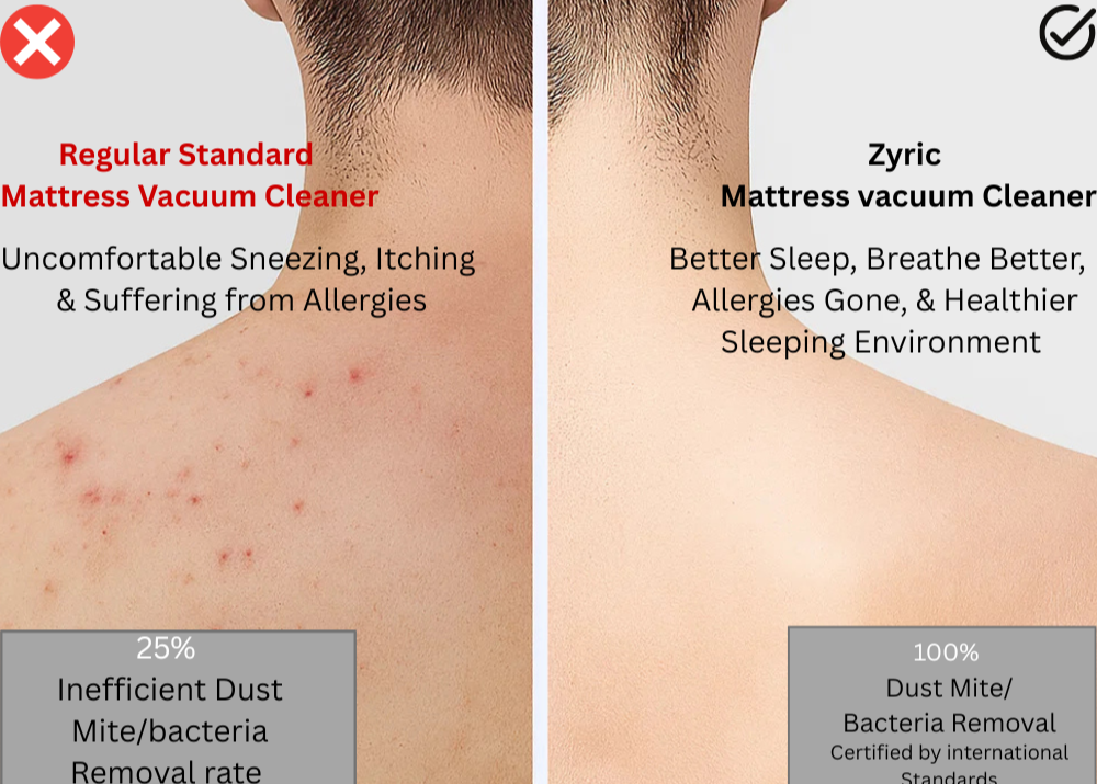 The Zyric Mattress Vacuum Cleaner brings you the core benefits of a professional mattress cleaning—like allergen removal, pet fur elimination, dust mite control, and a healthier sleep environment—all from the comfort of home. Its powerful suction, UV-C sterilization, and 60 °C hot air technology deliver a visibly cleaner bed and fresher air in just minutes.